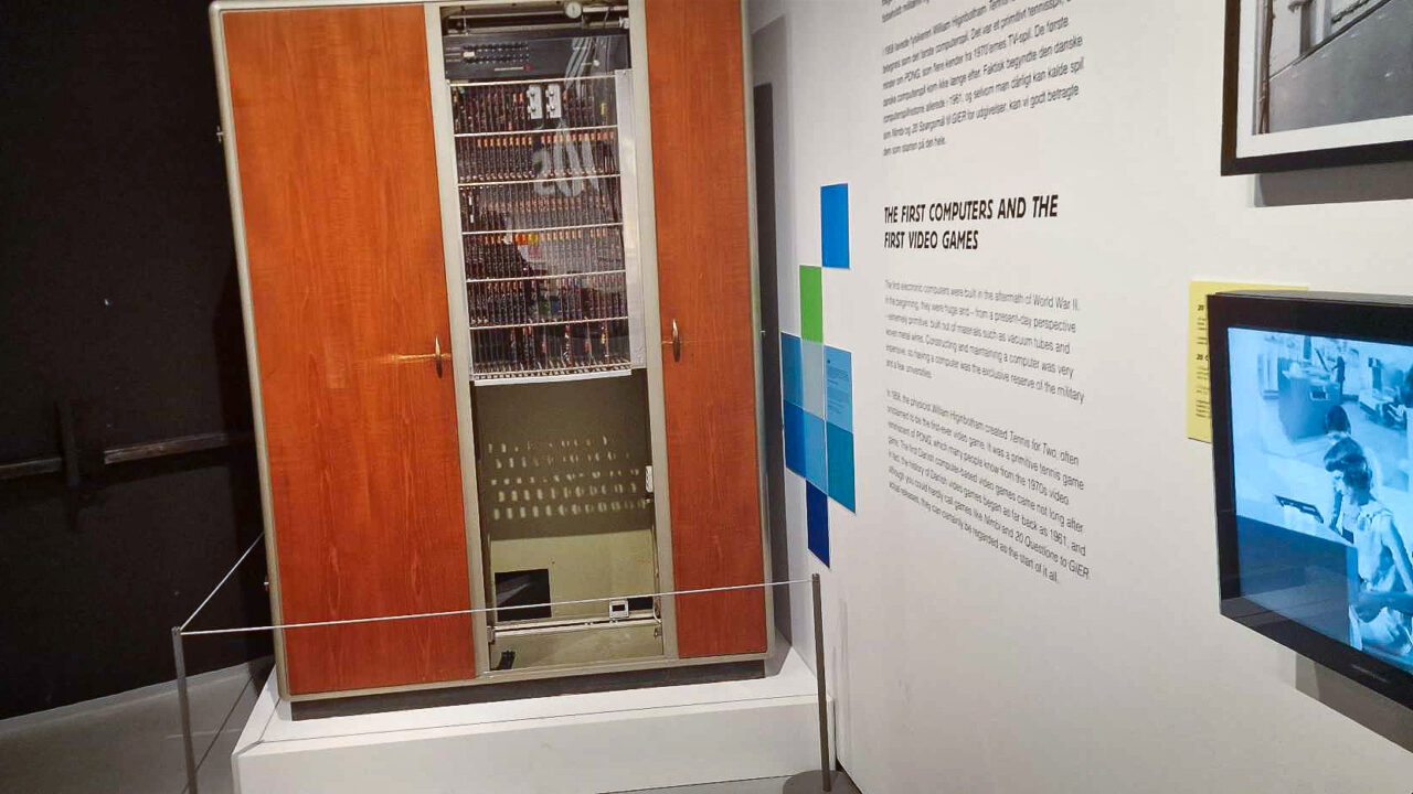 Det første, man ser i udstillingen, er en KÆMPE maskine. Det ligner nærmest et skab, men næh nej, det er en meget gammel computer, faktisk en af de første computere, hvor man kunne spille “Tennis For Two”, som er lidt ligesom Ping Pong.