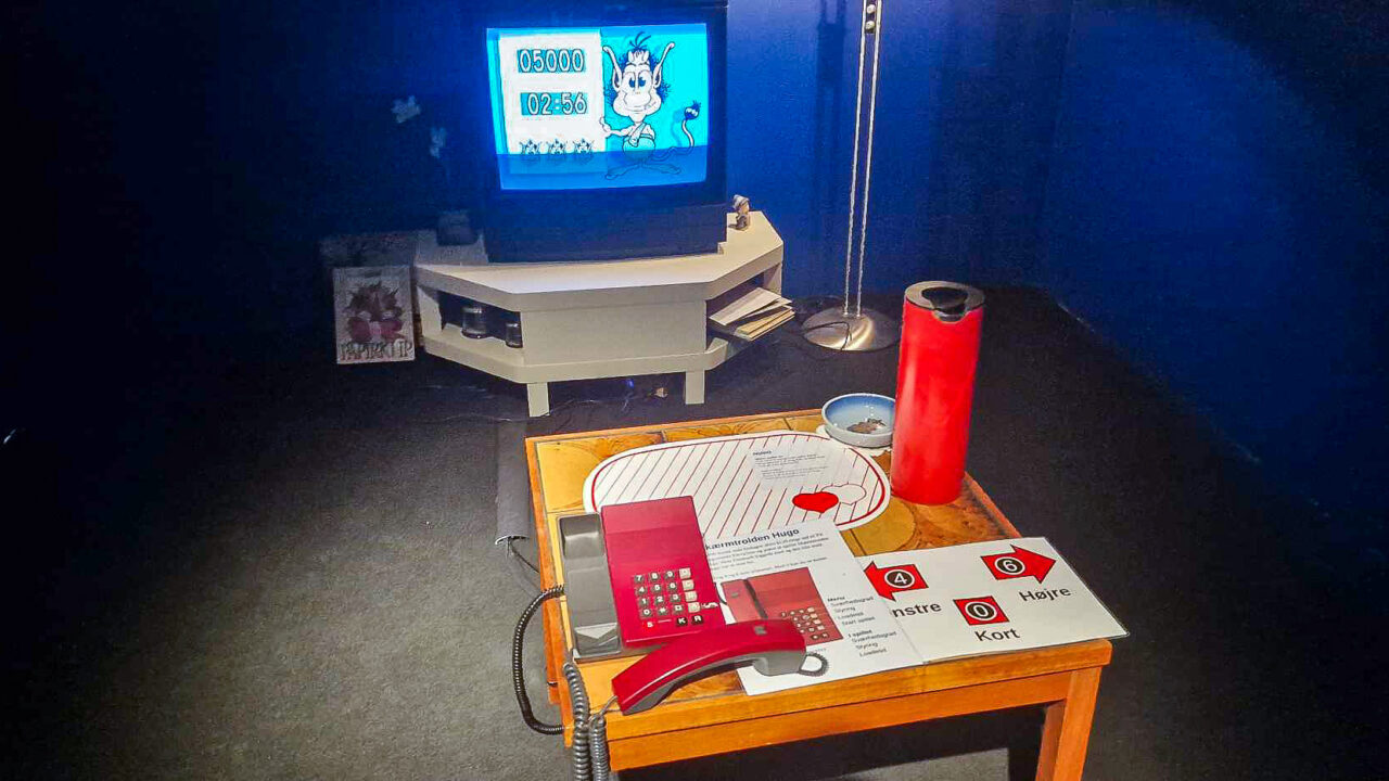 Udstillingen har også specifikke rum med vigtige ting fra dansk gaminghistorie. Et af de rum var Skærmtrolden Hugo, hvor man er i en hyggelig, lille stue med et tv og en telefon, man bruger til at styre med.