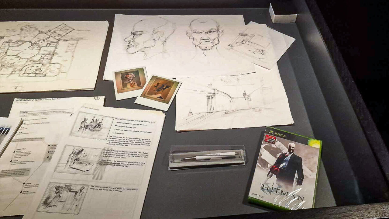 Et af de andre rum var nærmest en biograf, hvor man så et interview med Hitman-udviklerne IO Interactive. Der var også glasmontrer med karakterdesign af Agent 47 og et map-design af en af de første baner, de lavede.